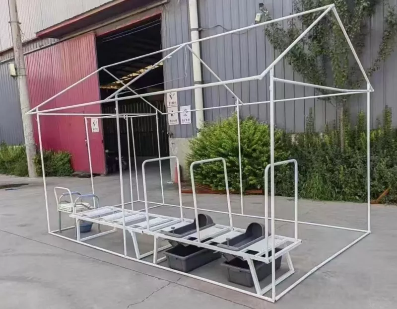 გადაუდებელი კატასტროფების დახმარების ტუალეტის კარავი აღჭურვილია ორმაგი დაქანების ვერტიკალური კედლის სტრუქტურით. ფოლადის ჩარჩო გადის ჟანგის საწინააღმდეგო დამუშავებას, ტილო იყენებს წყალგაუმტარ და ცეცხლგამძლე მასალებს, ხოლო სანტექნიკა დამზადებულია მაღალი სიმტკიცის მასალებისგან, ზუსტი ზომებით უზრუნველყოფილი ყალიბის ფორმირებით. სენსორული განათების სისტემამ გაიარა წყალგაუმტარი და დარტყმაგამძლე ტესტები, შესაფერისია გარე გამოყენებისთვის. მოდულური დიზაინის კონცეფციის გათვალისწინებით, კარავი იძლევა სწრაფ აწყობას და დაშლას - ფოლადის ჩარჩოს კავშირები იყენებენ ჩონჩხი სახსრებს, რაც ხელსაწყოების გარეშე დაყენების საშუალებას იძლევა. ვენტილაციის სისტემა იღებს კონვექციურ დიზაინს მწერებისგან დამცავი ეკრანებით ჰაერის შიდა მიმოქცევის შესანარჩუნებლად.